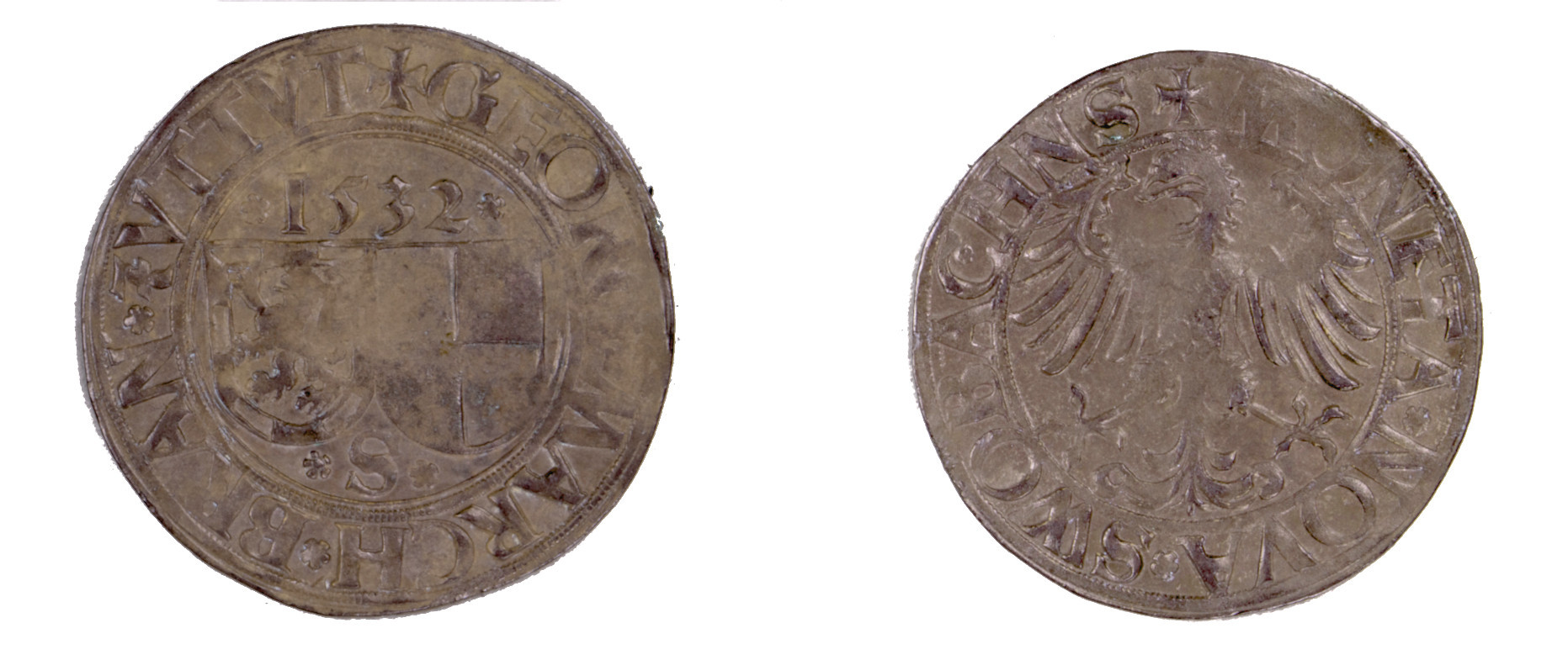 Burggrafenschild und Zollernschild, darüber 1532 zwischen zwei kleinen Blüten, unten S zwischen zwei kleinen Blüten; Umschrift: GEORG * MARCH * BRAN * F(?)VTTVT +