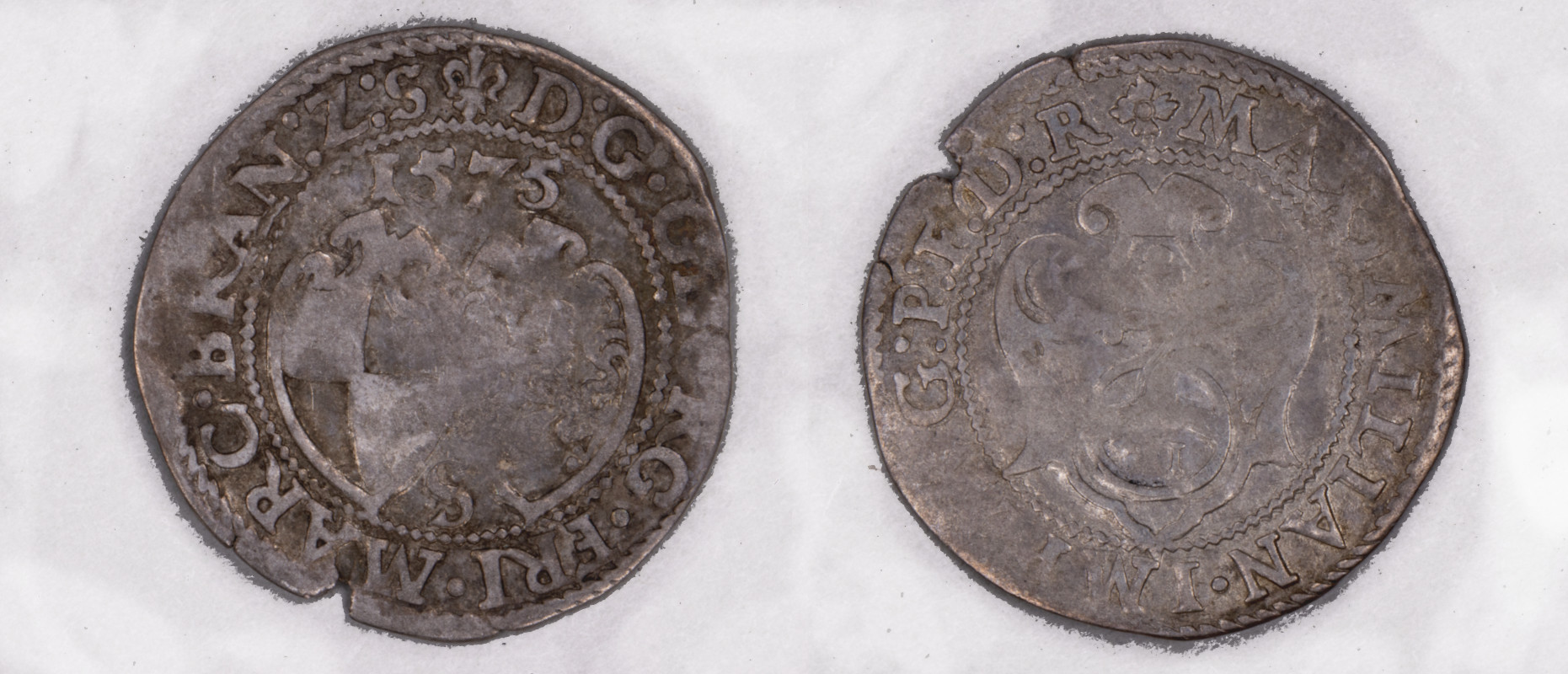 Zwei Wappenschilde: Links der Zollernschild, rechts der Ansbacher Löwe (kaum noch zu erkennen). Unten der Buchstage S für den Prägeort Schwabach, oben die Jahreszahl 1575. Umschrift, getrennt durch eine stilisierte Lilie: D.G.GEORG. FRI. MARC. BRAN:Z:S