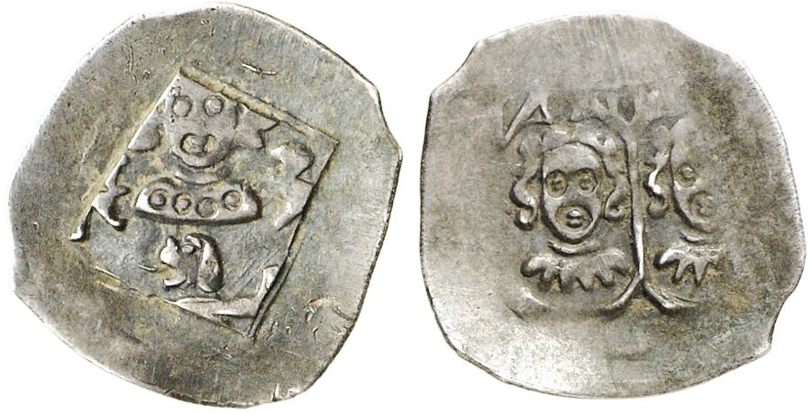 Die Form der Münzvorderseite mit dem flachen, unregelmäßigen Rand und dem in der Mitte erscheinenden quadratförmigen Porträtteil zeigt den Effekt des Vierschlags, der zur Münzprägung angewandt wurde: In den quadratischen Schrötling (Rohling) wurde zunächst das Porträtmotiv mit einem Schlag beidseitig eingeprägt. Dann erzeugte man durch 4 Hammerschläge auf die Seiten der Münze die fast runde Form. Dabei wurde, wie hier, manchmal das Porträt in Teilen wieder geglättet und zerstört.