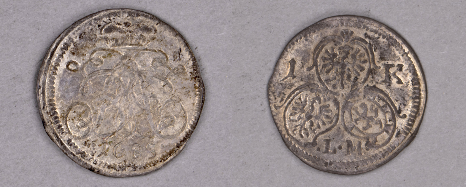 3 Wappen (oben: Adler nach links, unten links: Adler nach rechts ,unten rechts: Burggrafenlöwe nach links ), zu den Seiten daneben 1 - K (für 1 Kreuzer), unten · L · M · (für Landmünze)