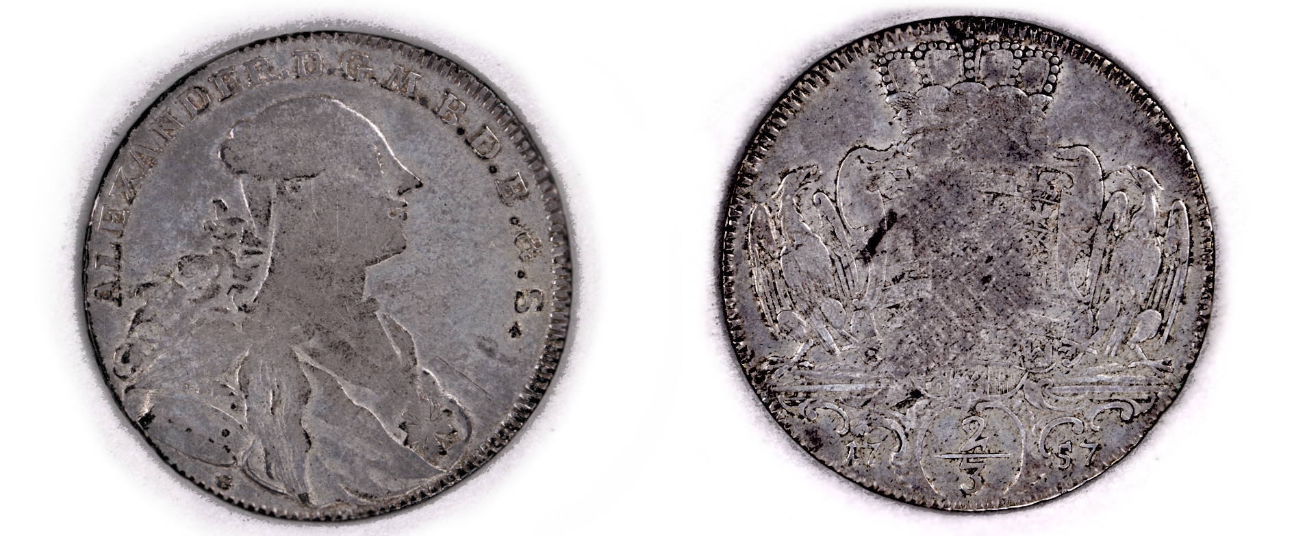 Brustbild mit Perücke, pelzbesetztem Umhang und Ordensstern, darunter das Kürzel G des Stempelschneiders Götzinger. Das Porträt ist nicht mehr deutlich zu erkennen, weil die Münze abgerieben ist. Umschrift: ALEXANDER.D.G.M.B.D.&.S.