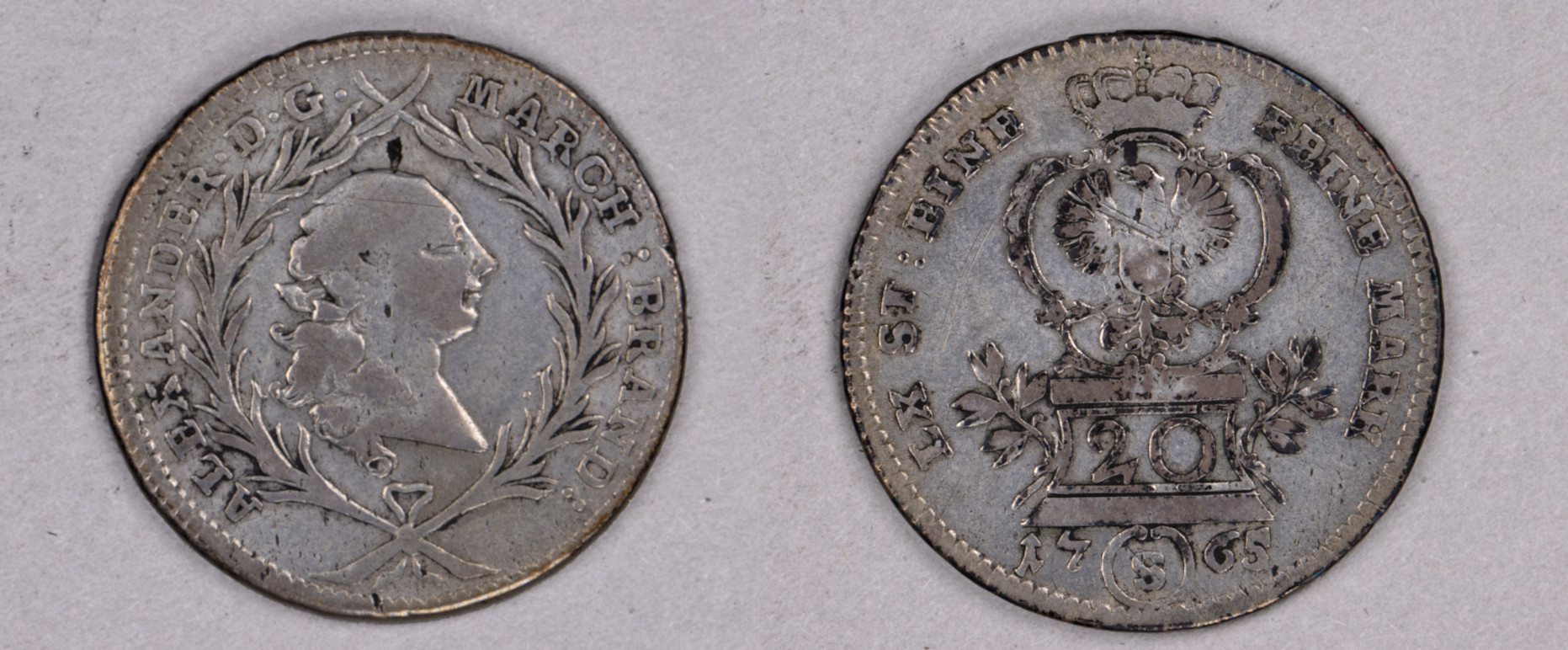 Nach links gewandter Adler in bekrönter Kartusche auf einem mit Lorbeerzweigen versehenen Postament mit dem eingeschriebenen Münzwert als Ziffer 20. Darunter teilt ein Medaillon mit dem Buchstaben S für den Prägeort Schwabach die Jahreszahl 1765. Umschrift: LX ST: EINE FEINE MARK